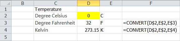 สิ่งสำคัญคือหน่วยที่ต้องแปลงต้องสอดคล้องกัน ดังนั้นผู้ใช้ Excel ต้องจดจำหน่วยที่ Excel รองรับ ในแต่ละมิติ ตัวอย่างการใช้สูตร Excel : Convert แปลงหน่วยอุณหภูมิ ดังภาพที่ 1